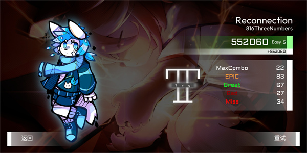 7、歌曲结束则游戏结束,然后可以查看到自己的分数,除此之外,游戏中还有很多玩法等着玩家们自行下载体验。