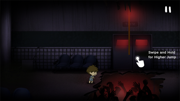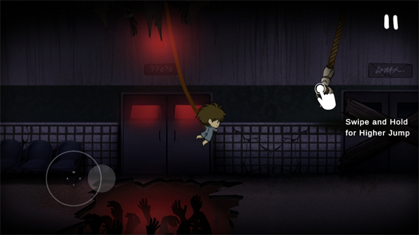 玩家走到中间位置之后,滑动右边屏幕进行跳跃,同时按住屏幕,抓住绳子,控制移动健,左右晃动,跳到对面。