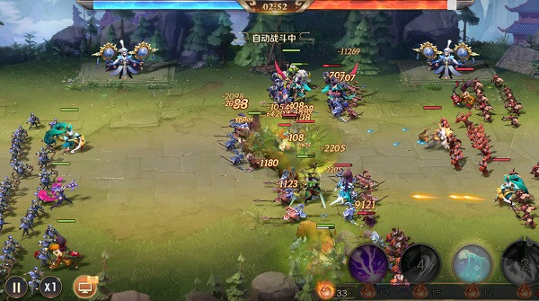2、竞技场战斗为自动战斗,左下角的暂停键点击之后可以呼叫出菜单进行特效上、音效上的设定,调整战斗速度的按键也同样在左下角,上方的红、蓝色血条可以展示双方当前的实力对比,可以更加容易的洞悉场上的形式