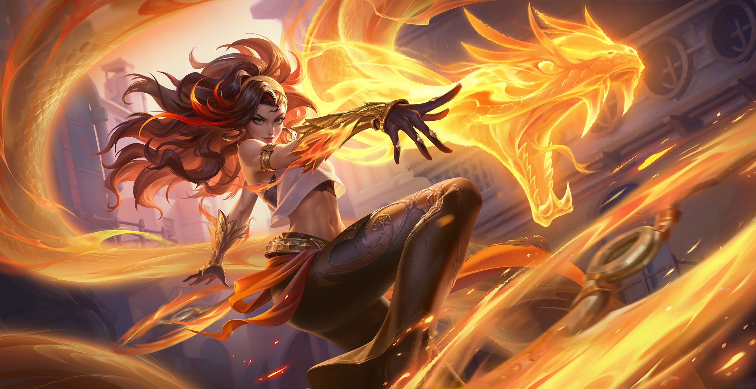 在指定位置召唤火蛇,之后火蛇会向自己移动,对沿路敌人造成伤害和减速。当环刃存在时额外对敌人造成伤害。不存在时缩减冷却。