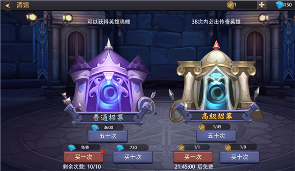 1、进入游戏内,玩家可先在酒馆内进行普通或高级英雄招募。