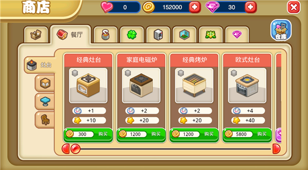 经营系统里有装修选项,选择商店,可以在这里买卖桌椅、墙纸、地毯等花样繁多的装修材料来帮你你打造餐厅,可以根据自己的喜好选择自己喜欢的装修风格,日式、欧式、中式,混搭不限制。