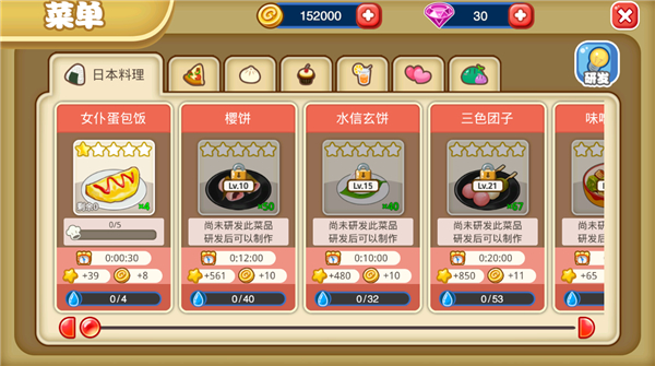 玩家可以在菜单系统里研发各种各样的美食:女仆蛋包饭、蔬菜沙拉、中华炒饭、春卷、汉堡、披萨、泡芙、盖饭等等。研发需要时间、金币、人员等,菜式越多客人就越多,赚的钱自然也就越来越多啦。