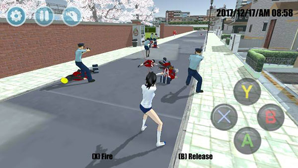 游戏里的恋爱系统也挺有意思的,要追男生就得不停夸他、送东西刷好感度,成功后还能带回家约会。不过我最想吐槽的是,男主角在旁边看着血腥场面居然无动于衷,这点设计得有点渗人。另外,游戏里还有喷气背包、驾车这些酷炫功能,能让你体验到最真实的高中女生生活。
