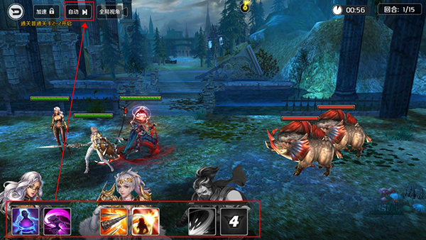 3、进入关卡后,玩家可以点击下方图标控制英雄攻击和释放技能,也可以点击上方的自动按钮,开启自动战斗,解放双手。