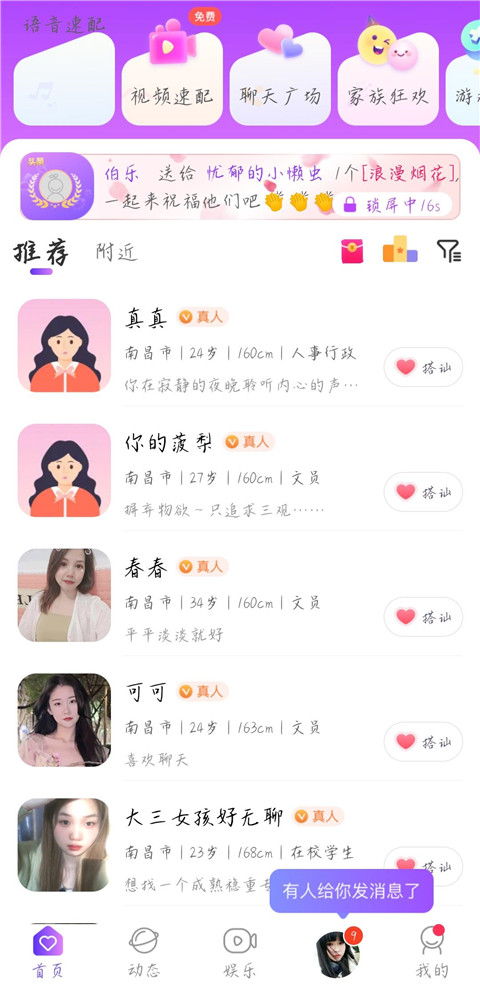 遇见同城的朋友,让缘分在身边发生,轻松找到另一半。 分享生活点滴,发现志同道合的TA。 参与各种兴趣话题的群聊派对,在这里总能找到和你有共鸣的人。 所有用户都经过真人验证,确保信息真实可靠,使用起来更安全放心。 还有海量主播在线直播互动,陪你一起度过欢乐时光。
