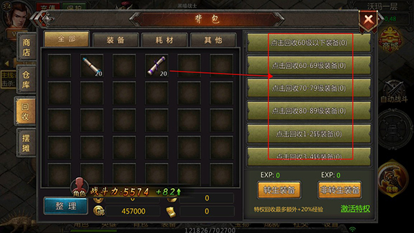 4、多余的装备还可以再背包内进行回收,回收分类非常详细,玩家可以自由选择。
