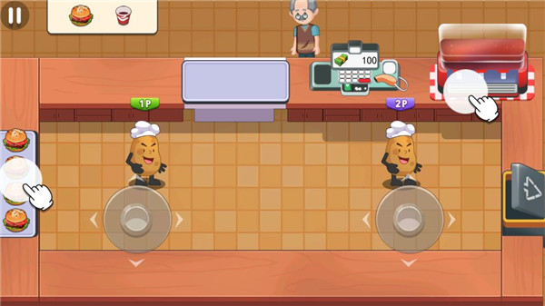 3、合作模式顾名思义则需要两人合作一起完成客人的需求,如图所示:分别移动角色至所指位置,制作食物,相互配合完成订单务。