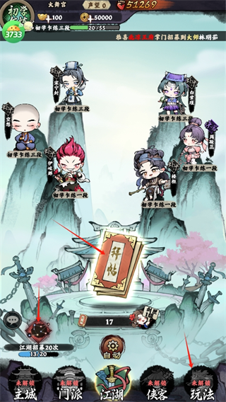4、游戏主要玩法就是点击拜帖招收高等级人物提升等级后期开启主城门派等玩法。