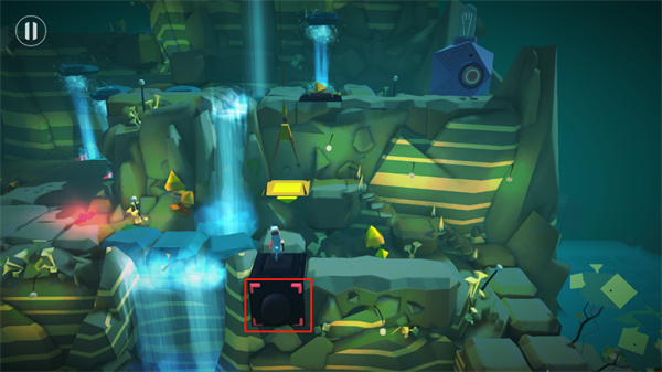 3、玩家顺着小精灵移动到下图的位置上面,然后踩住机关,会发现出现一个石头,然后在点击红色的按钮就可以出现又一个石头,然后就可以顺利的通过瀑布了。