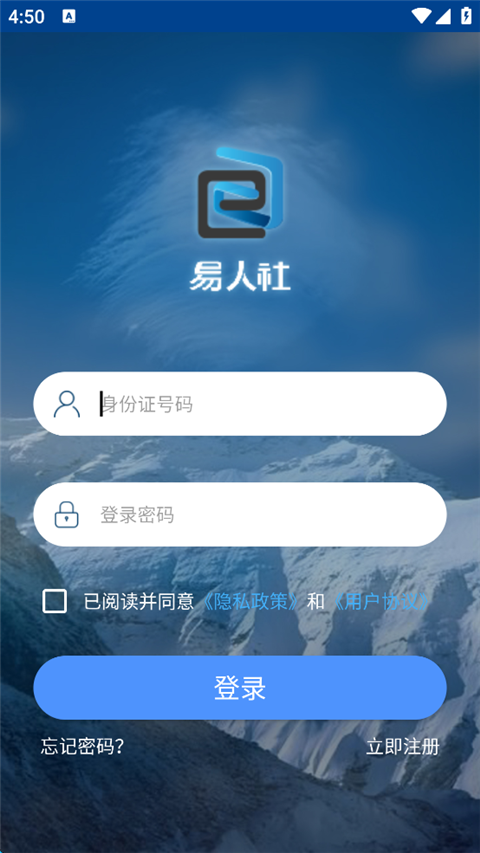 1、打开易人社系统App,找到“立即注册”,在打开的页面里填入相应的信息点击“注册”。