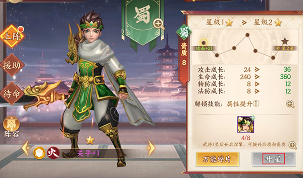 每次点亮升星节点都能获得属性加成,升星不仅能提高武将基础属性,还能解锁新技能,进一步增强战斗力。万能碎片是一种非常珍贵的资源,建议优先用于高潜力武将的培养。