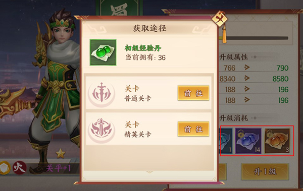 3、升级需要消耗经验丹,当材料不够时,会弹出材料获取界面,帮助主公前往获取经验丹。