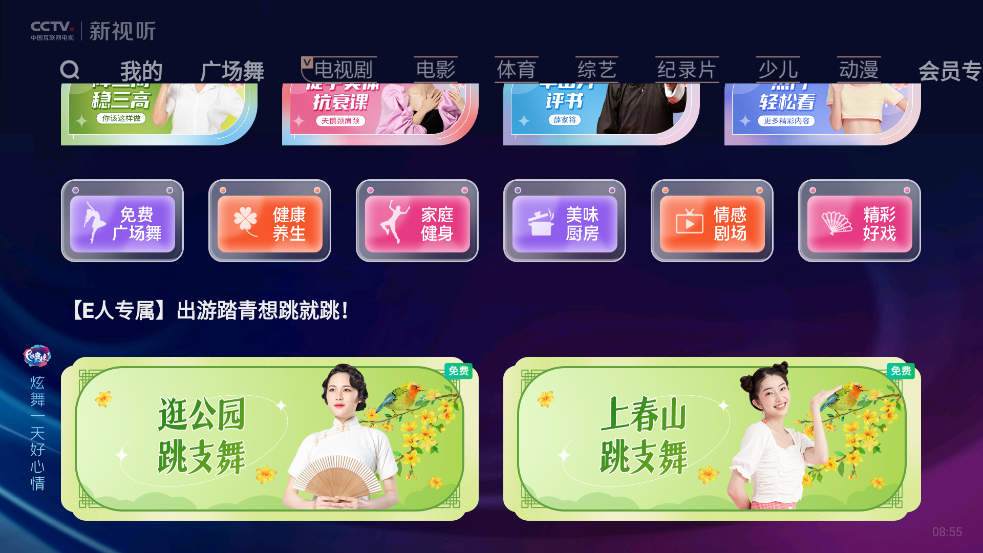 CCTV新视听炫舞TV版是一款专为智能电视平台打造的舞蹈内容应用,由中央广播电视总台(CCTV)出品,旨在为用户带来丰富多元的舞蹈观赏、学习体验。为满足全国舞蹈爱好者们看舞、学舞、跳舞以及“以舞会友”的多元需求,炫舞未来孵化数十位广场舞领域明星导师,专为广大舞蹈爱好者们提供全舞种覆盖的舞蹈内容聚合及近千支原创4K高清舞蹈教学视频,成为中老年广场舞健身领域的首选平台。
