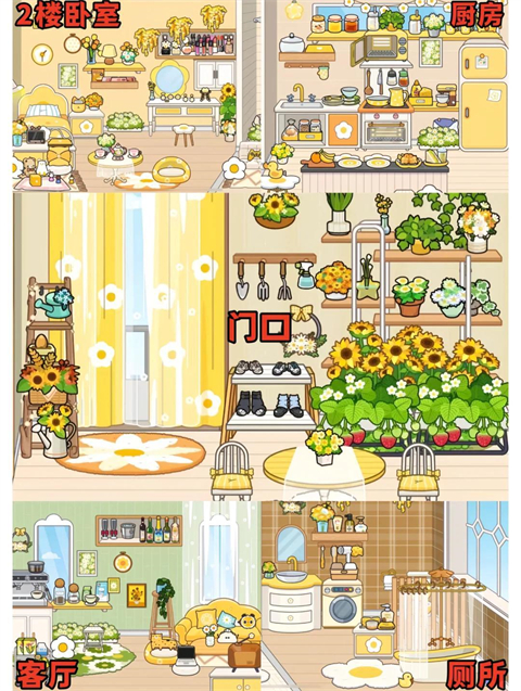 1、米加小镇更新黄色花朵双重自建房、蓝图保存功能、黄色公寓家具包。