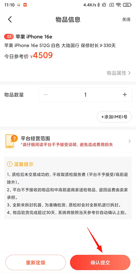4、接着填写设备使用情况,功能情况,外观等,最后点击确认;