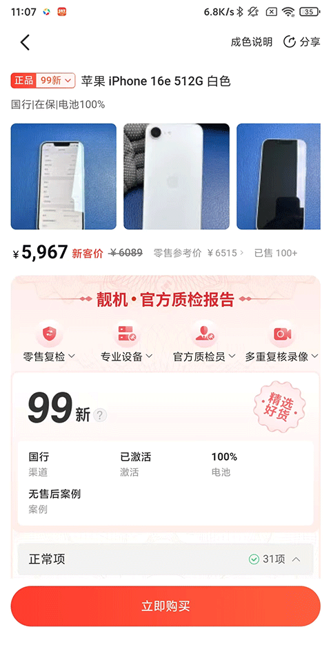 2、查看官方验机报告和成色图片,确认无误后点击立即购买;