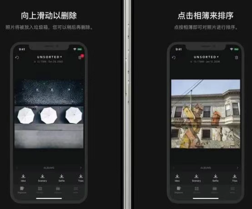 1、上滑删除图片,点击相册就会分类到相册,简单易用的逻辑,分类整理照片非常简单方便。