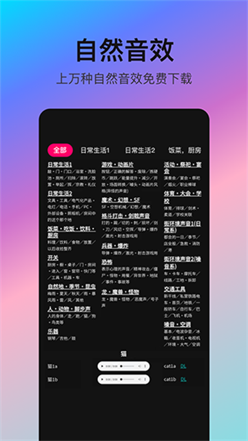 8、【自然音效】:上万种自然声音永久免费下载,如:鸟叫/猫叫/流水/昆虫/初夏/汽笛/乐器/铃声/游戏音等