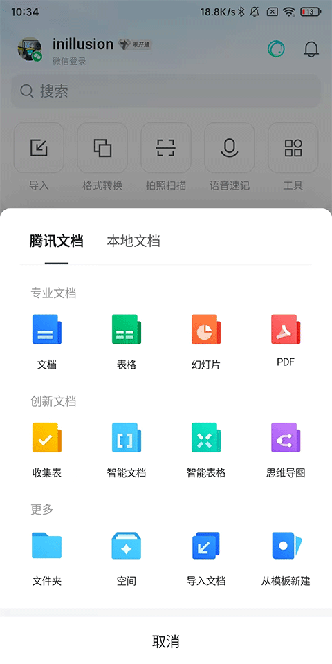 2、创建文档:选择文档类型,文档、表格、幻灯片、PDF......