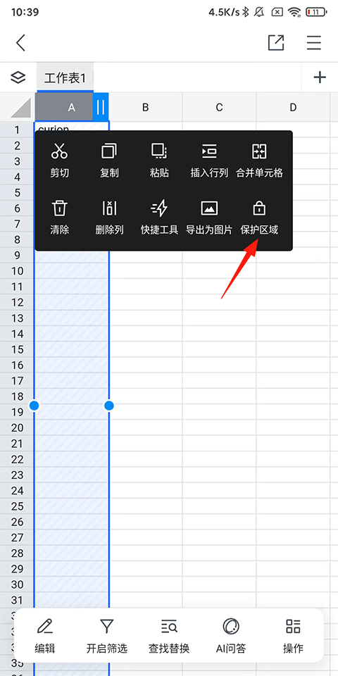 2、输入内容后点击需要隐藏内容的列头,在弹出快捷菜单后点击【保护区域】;