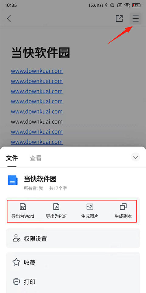 3、创建或打开文档后点击右上角的三横线扩展按钮,在弹出的功能列表中选择导出类型:Word/PDF/图片等;