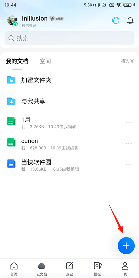 1、打开腾讯文档APP,在云文档页点击已有文档或创建文档;