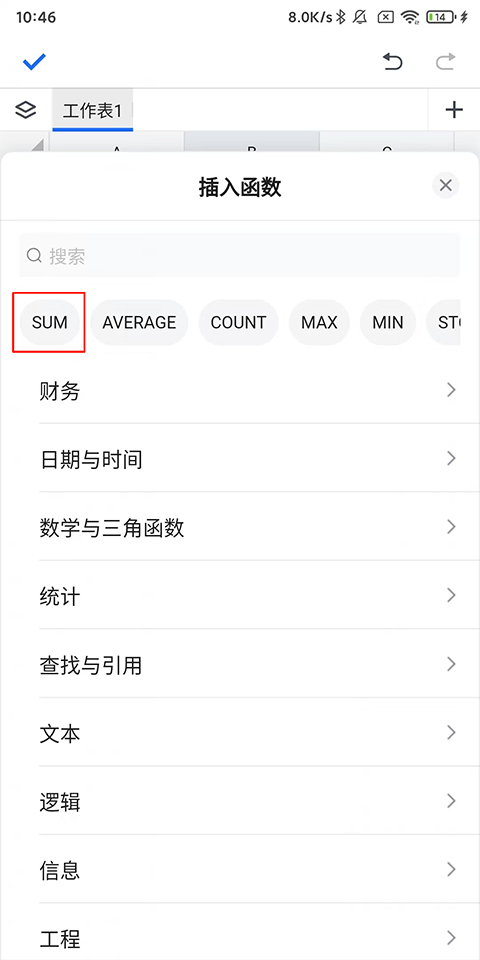 3、在插入函数页搜索或下方快捷列表中选择【sum】求和函数;