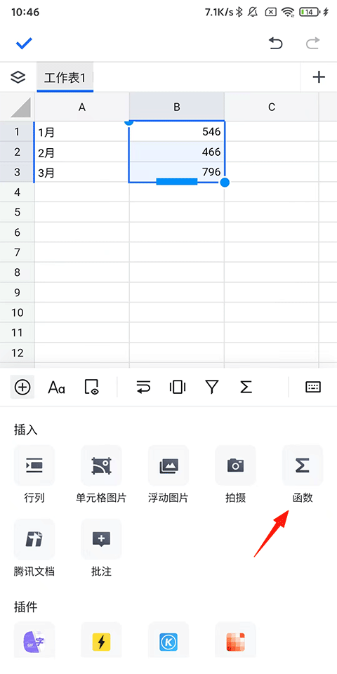 2、进入(创建)表格后,选择需要进行求和的区域,点击左侧的【+】按钮-【函数】;