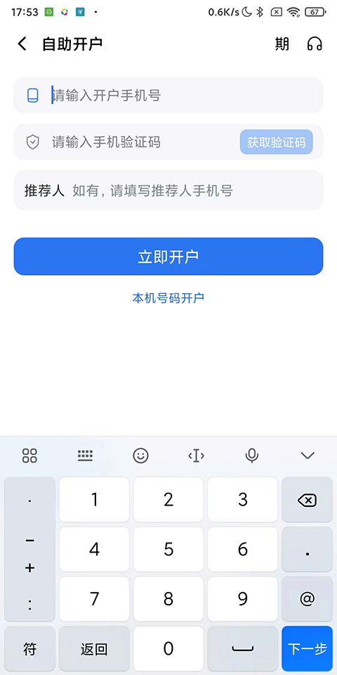 2、输入手机号和验证码完成开户;
