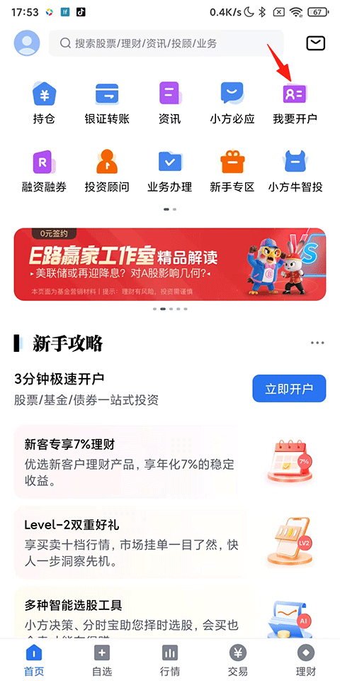 1、打开小方证券App,进入首页先点击我要开户;