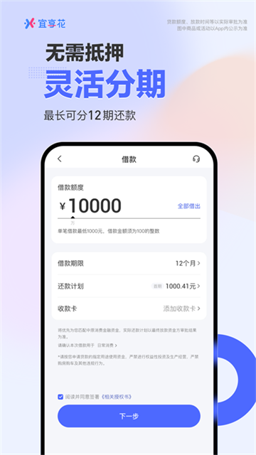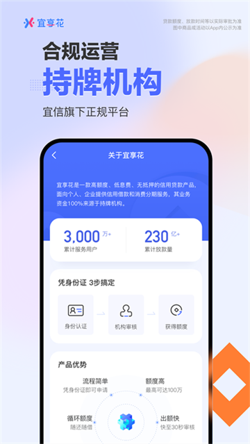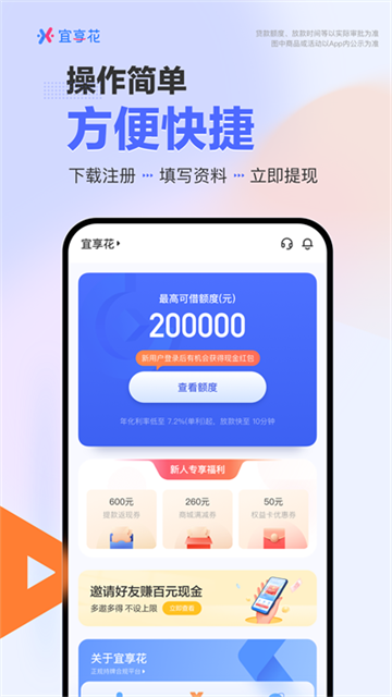 宜享花app是一款高额度、低息费、无抵押的信用贷款软件,通过融合运用人工智能、云计算等前沿科技,建立了灵活高效的信用评估及管理体系,实现了实时计算、秒级响应的全自动化审批,从注册、申请到提款的全程,用户均可在线上完成,是一个非常可靠的在线贷款平台,借款操作方便快捷,只需一键登记身份信息就能贷到款,贷款速度快,快速到达账户。而且这款平台的使用门槛很低,最重要的是利率低,无抵押,最高的贷款额度高达20万,循环金额更灵活,只需要简单三步就可以申请,实力雄厚无需任何担心,还有专业团队为你保驾护航,不断提升你的信用额度能贷到更多哦。支持12期分期还款,让你还款时毫无压力!