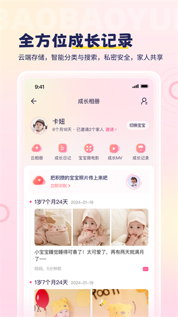 支持照片、视频、日记等多样化的记录方式,让家长可以随时随地的记录宝宝的变化,云存储平台可永久保存。