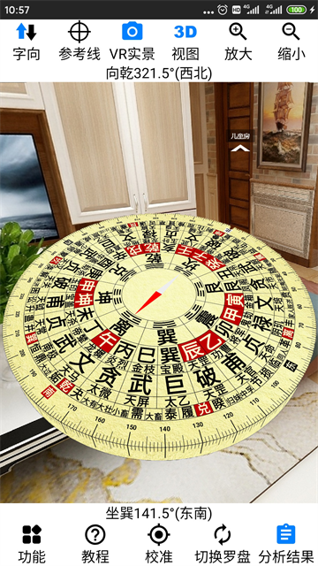 4、摆放罗盘后一键分析八宅布局、九宫飞星、流年,自动辨别天医、生气、延年、伏位、五鬼、六煞、祸害、绝命等方位。点击“VR实景”后自动为真实场景添加方位属性标签。