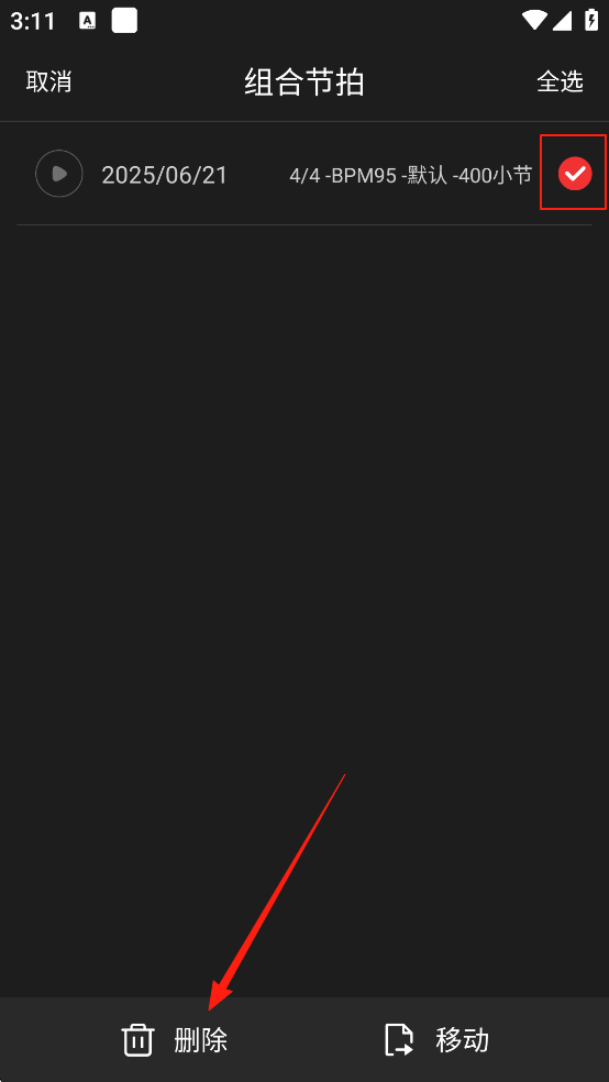2、进入【组合节拍】界面后,可以看到自己已经添加的节拍,点击【选择】