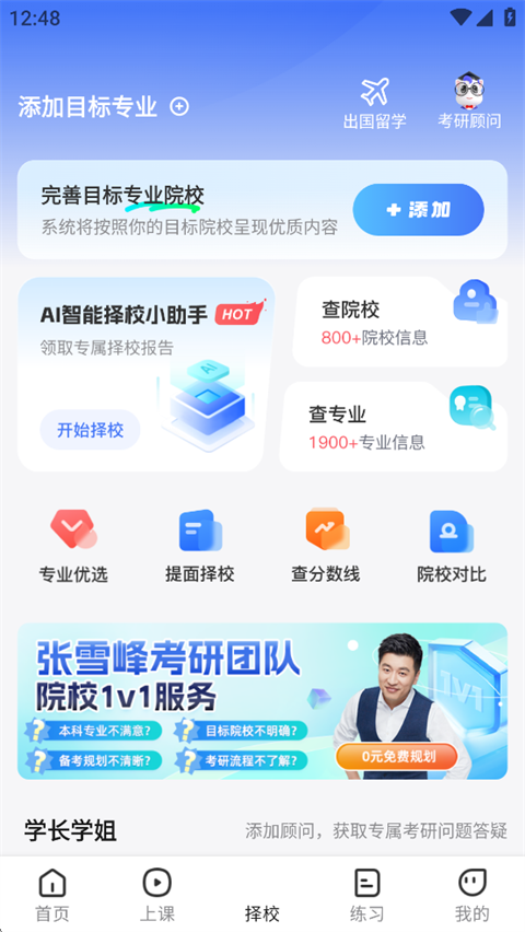 研途考研App是一款专为考研党设计的学习平台,功能挺多的,适合备考的学生用。里面有很多学习资源,比如名师课程、学习视频和各种考研资料。特别是有张雪峰、徐涛这些大牌老师讲课,内容很丰富。还有个错题记录功能,方便复习巩固知识点。App里还提供海量试题和择校工具,能帮助用户更高效地备考。