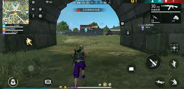 6、装备武器搜索得差不多后,我们就可以点开地图看看安全区的位置了,白色圈内就是安全区,而且随着时间流逝,安全区会越来越小,我们要待在在安全区内才能避免被毒雾所感染。如果大家离安全区较远,那么可以在路上找一辆车,然后开车前往安全区。靠近车辆后,点击驾驶即可开车,开车方法跟大多数赛车游戏差不多,左下角两个按钮控制方向,右下角择优油门和刹车。我们可以提前开车到安全区中心区域,然后继续搜索物资,并且随时注意周围其他玩家。