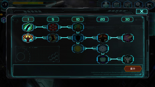 玩家点击界面右上角第二个图标,其显示的是技能栏,玩家可以通过花费金钱给技能进行升级,更容易消灭敌人。