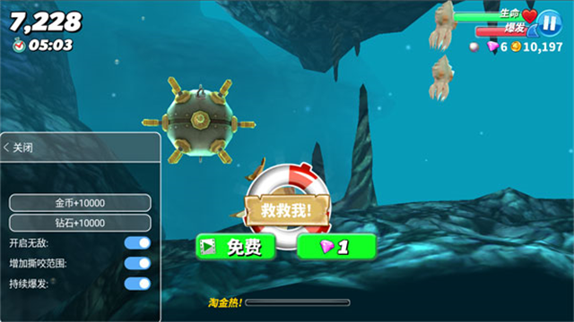 《饥饿鲨世界》是一款休闲手机游戏,玩法虽然简单但极具吸引力。玩家扮演鲨鱼,在海洋中冒险、吃东西来维持生命并解锁新品种的鲨鱼。游戏中有多个场景和关卡,比如冰天雪地、外星基地等,还有各种任务和敌人需要挑战。通过内置修改器版可以轻松获得无限金币和钻石,并开启无敌模式或增强撕咬范围。