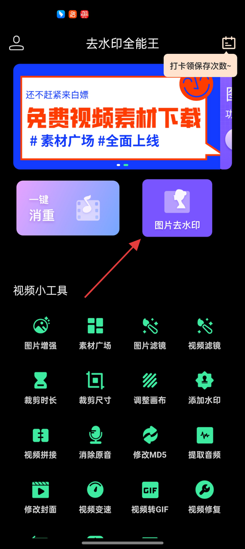 1、进入去水印全能王App后点击首页的图片去水印