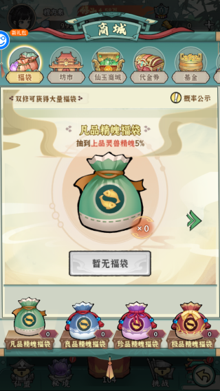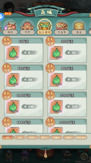 商城里的东西挺多的,福袋、坊市、仙玉商城……感觉选择也挺丰富。首充送双倍仙玉,0.1折充值,这福利力度挺大的,尤其是对喜欢氪金的玩家来说应该很有吸引力。不过,自动闯关和挂机功能让不怎么花钱的玩家也能轻松变强,这点设计很聪明。
