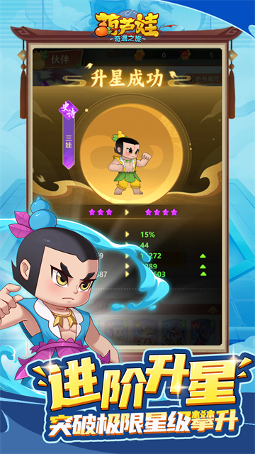 葫芦娃奇遇之旅是一款竖版放置卡牌手游,以童年ip《葫芦娃》为游戏的基本蓝图,画面精细,完美还原了动画中的场景与经典角色。在游戏玩法上采用了挂机放置的玩法,玩家只需在闲暇时间上线游玩即可,肝度低且策略性较强。同时玩家还需要根据葫芦娃的属性进行针对性的升级,提升整体实力,应对前行路上的强悍敌人!