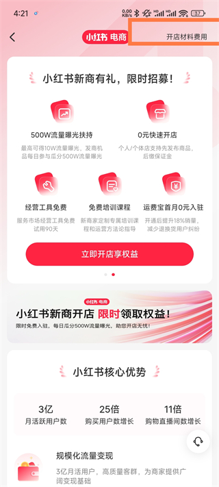 1、在立即开店权益的右上角点击开店材料费用