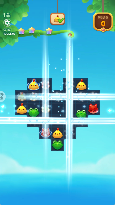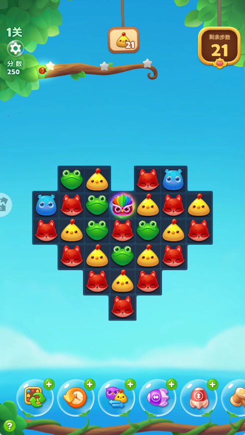 滑动手指让三个及以上的同色小动物横竖相连即可消除,完成每关的指定消除目标即可过关!