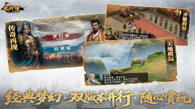 游戏以《水浒传》的故事为蓝本,展现了北宋末年的动荡局势和梁山好汉们反抗朝廷、替天行道的传奇故事。玩家需要在纷争四起的世界中招募武将、培养队伍,挑战各种副本和 PvP 玩法。
