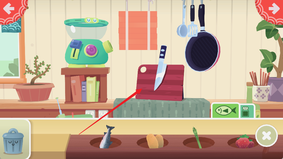 4、到切菜台/工作台选择合适的厨具——刀具用于切片、锅具用于煮饭或处理热菜、卷帘用于成型。