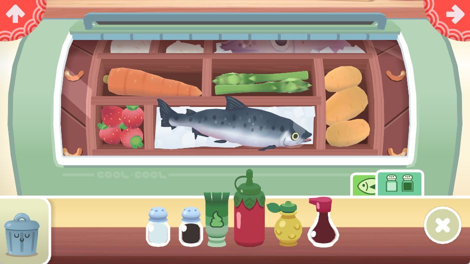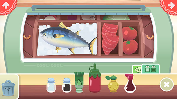 3、打开食材栏,从冰箱或备料区取出订单所需的原料(如鱼片、鳄梨、米饭等),按清单准备好。