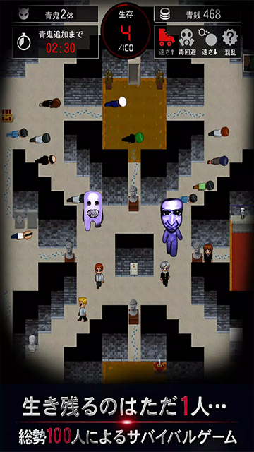 在《青鬼Online》中,100名玩家与青鬼同场竞技(其中部分为NPC),你将扮演其中的一员,目标是躲避青鬼的追击,存活到最后即获胜。