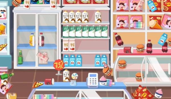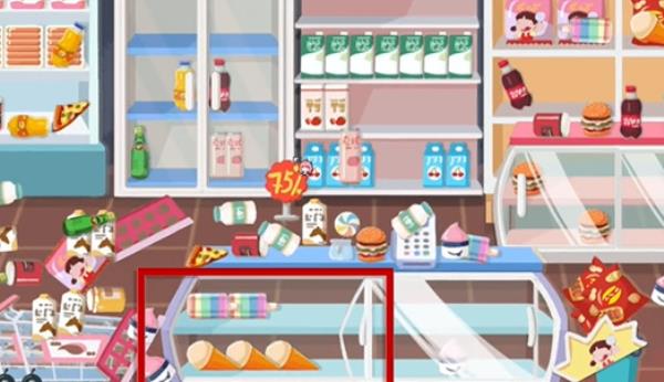 2、第二步:接着我们,注意最左边的冰箱和旁边的柜子上有这中已经放好了的零食,我们跟着把一样的零食放好就可以了。