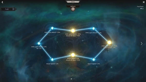 透过黄道宫,可以使用升级获得的属性和天赋点来设定角色。使用特性点数增加力量, 敏捷和智力;使用特性点数增强特定的技能效果。可以使用金币或遗忘星尘来重置黄道宫。